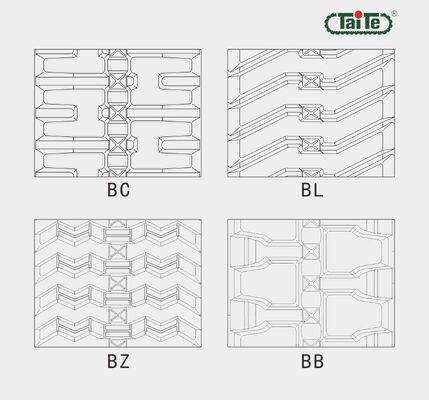 | Ukuran jalur | Lebar panduan bagian dalam (A) | Lebar panduan luar (B) | Lebar bagian dalam tinggi (C) | Lebar luar tinggi (D) | Ketebalan jalur (E) | Pola lug | Jenis panduan | Berat mesin maksimum (kg) | Pengamatan |